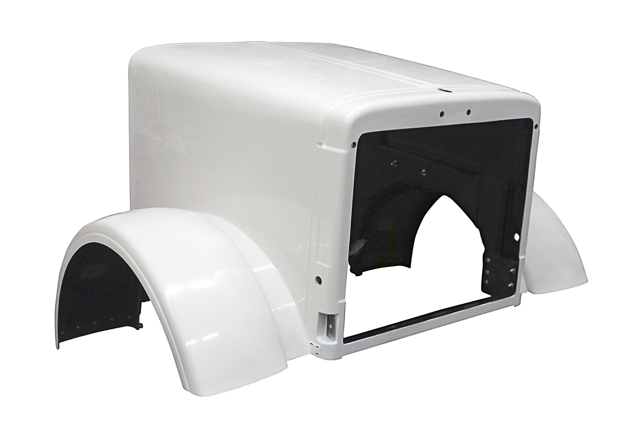 - Fiberglass replacement for OE aluminum hood 119″ BBC with replaceable fenders